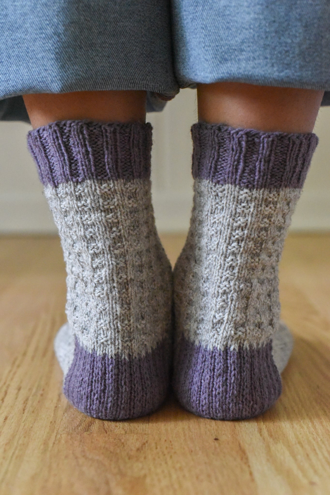 The finished pair of socks, made in a size medium to fit a US 7.5 women’s shoe size, weighs 70 grams in total (for two socks).