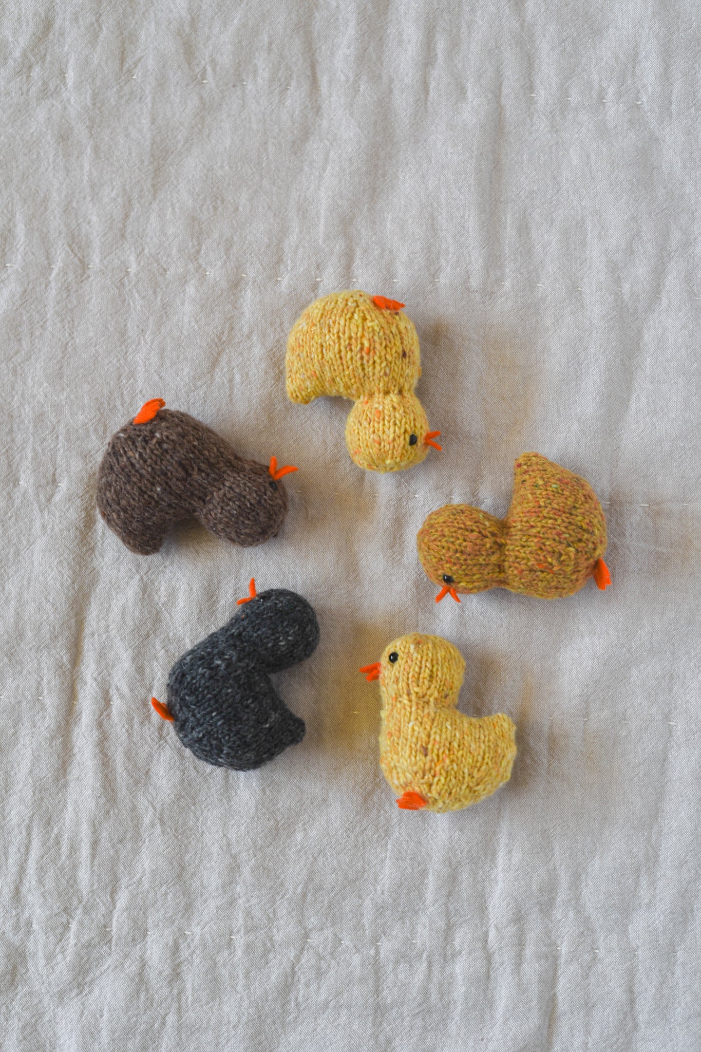 * Enough DK weight wool yarn to make five chicks and five eggs, in the colorways creamy white, brown, light blue, black, and gold.